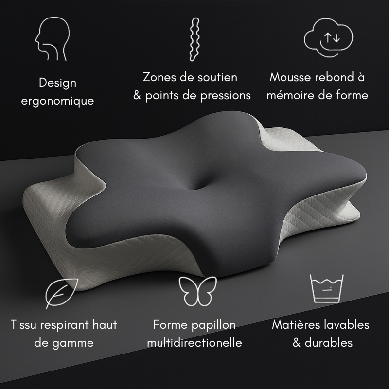 Sa forme papillon rĂ©aligne naturellement la nuque et libĂšre les tensions⊠et lâendormissement arrive enfin sans effort.